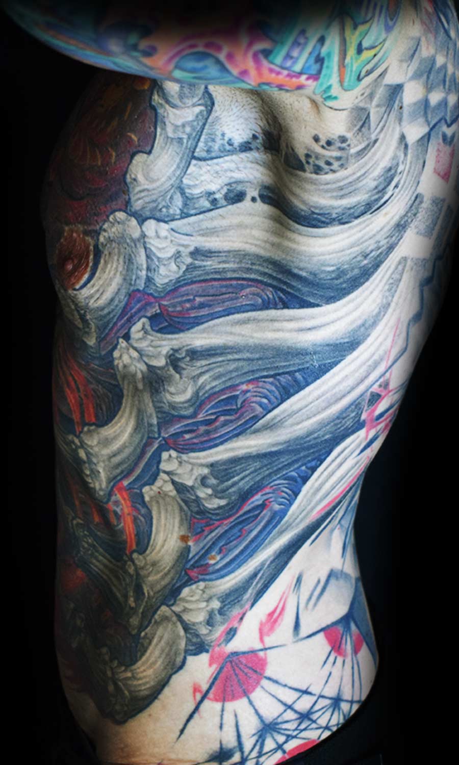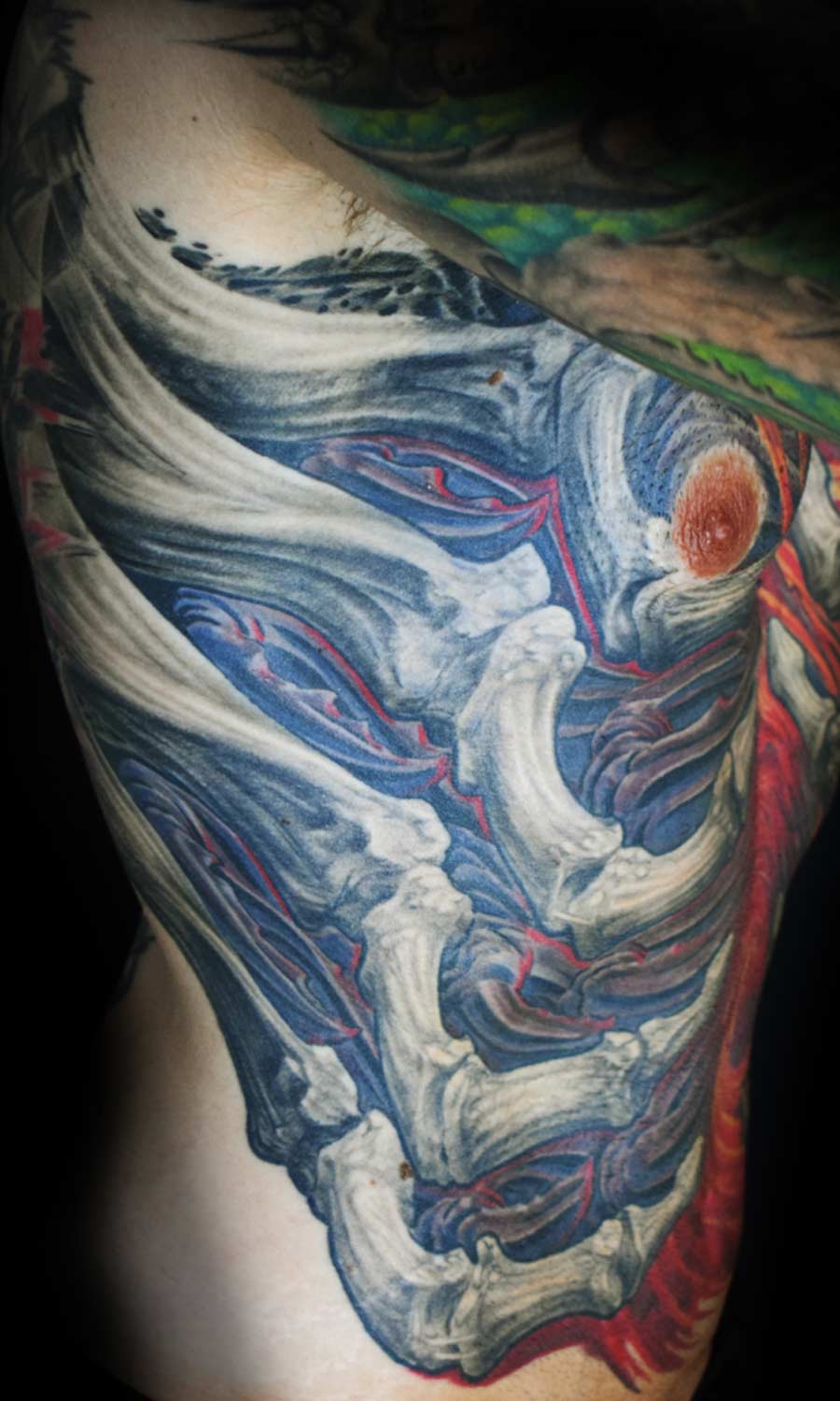 Um die Zwischenräume der Finger auch noch ansprechend zu füllen schlug ich sich an die Form der Finger anpassende Klauen vor. In dem Sinne ein Fraktal. Angelehnt an das Finger Tattoo. Bloß in der Art wie Scheren von Schalentieren. Die Finger wurden zum Anpassen an die Form des Brustkorbs mit perspektivischen Verkürzungen dargestellt. Folglich auch, um die Seiten als längste Flächen eher „ruhig“, die vorderen Glieder eher dynamisch zu gestalten. Und nachdem der Drache in Farbe sein sollte, in der Kategorie „burn“, also schön feurig-flammend, war es nur naheliegend den Hintergrund auch farbig in tiefer und vordere Bereiche aufzuteilen. Je weiter zur „hinteren“ Seite gelegen desto mehr ins Blau-Graue, je weiter nach „vorne hin ins Rot-orange. Zugleich konnte ich die Finger demgegenüber in Schwarz-Grau zu gestalten. Dadurch werden die Finger nach vorne gedrückt, sind aber gleichzeitig eher morbide, drückend. Düster, würde so mancher vielleicht sagen. Die Farben waren dabei mal wieder Sondermischungen aus Komplementärfarben, die den „dreckigen“ Touch noch unterstützen. Leider ist es schwierig, auf Bildern gleichzeitig die Wirkung von Schwarz-Grau und Farbe in Idealform aufzufangen, gerade zur Seite hin ist das Blau noch dunkler im Original.
